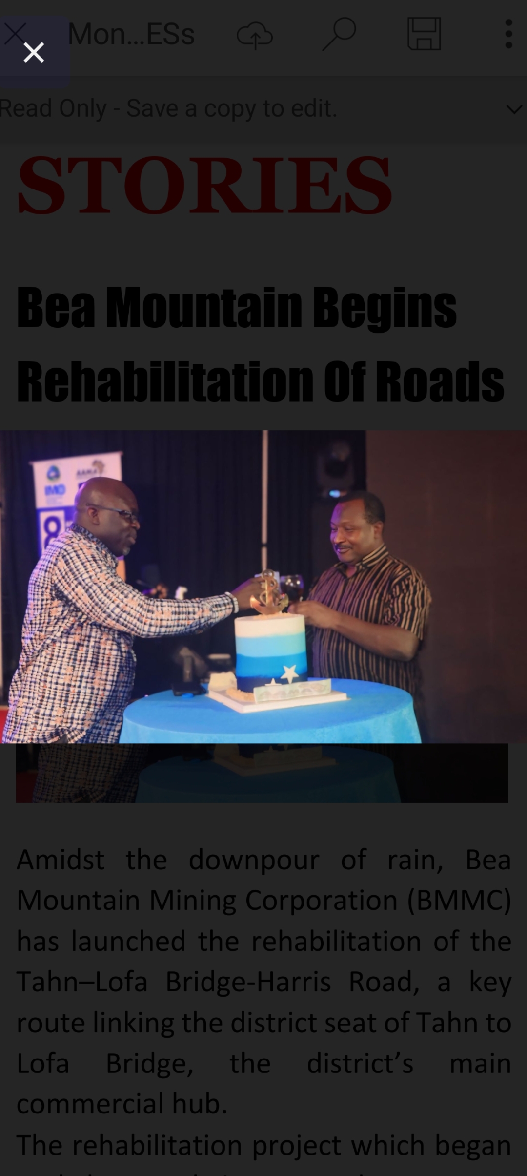 In addition to those projects, BMMC recently rehabilitated and dedicated the Tahn–Weajue-Mafala corridor, as well as the Jenneh–Macca back road. The company also commenced works on the Mbaloma-Sinje route and gave the Banfor road-its first major facelift since the end of the Liberian civil war.