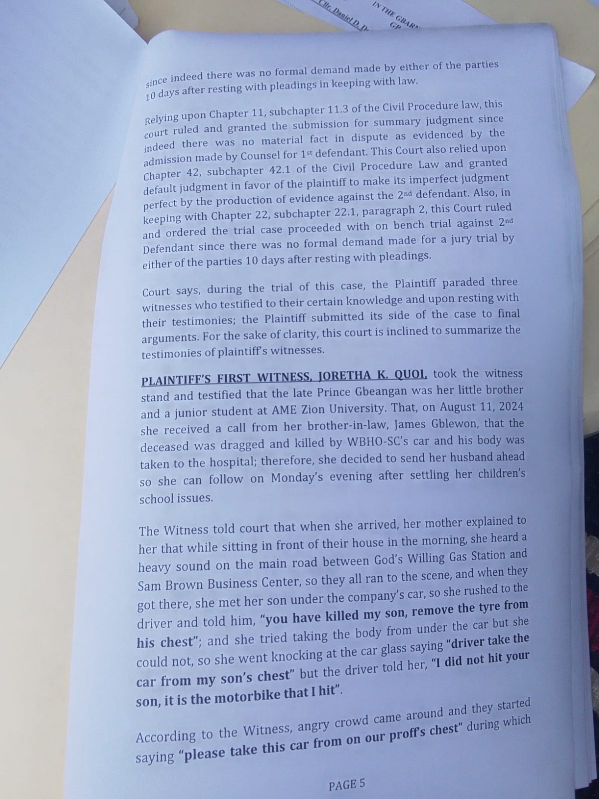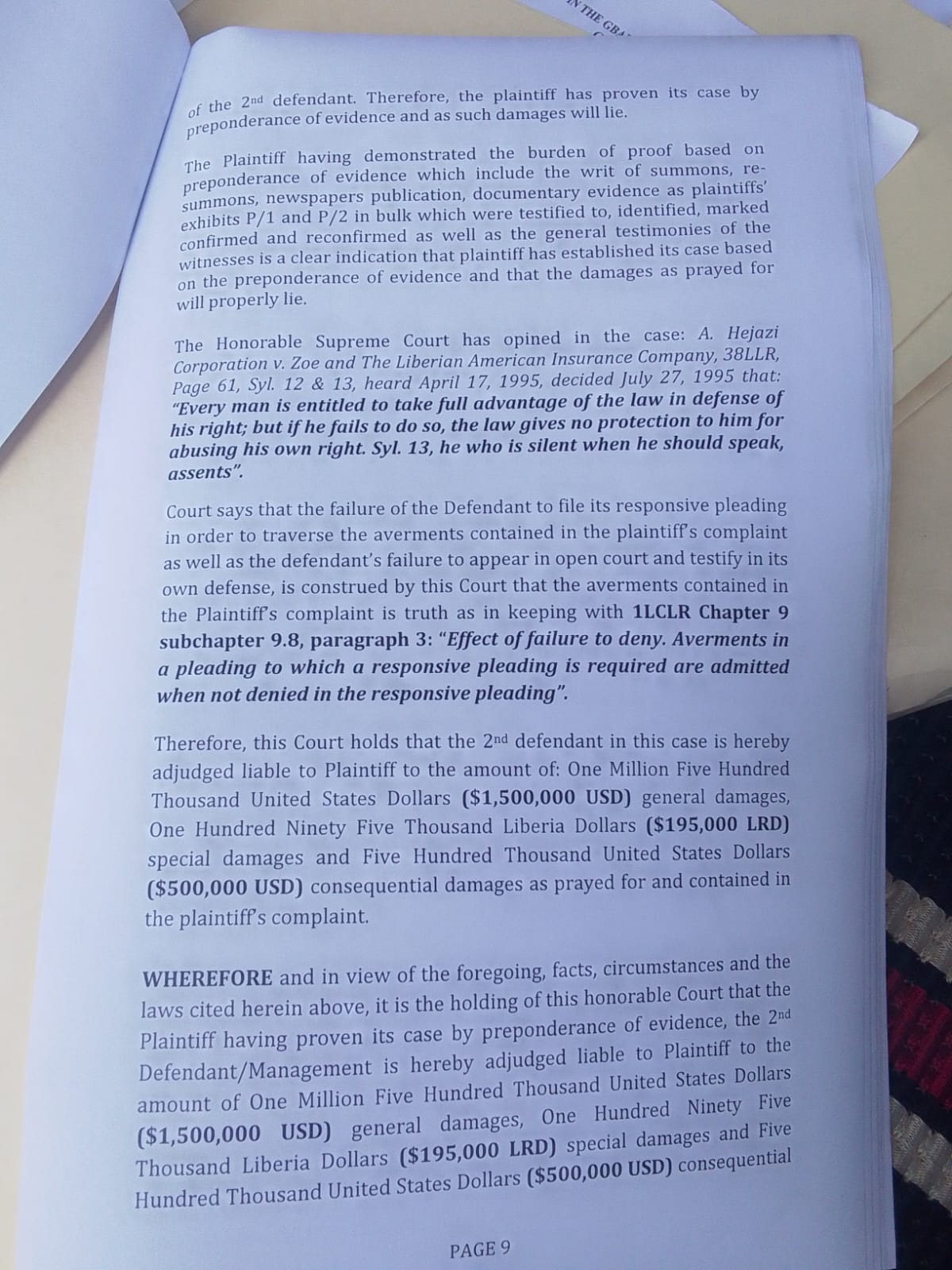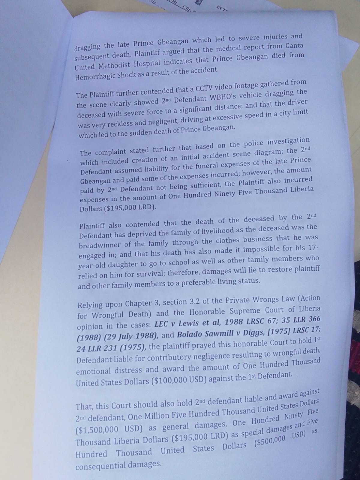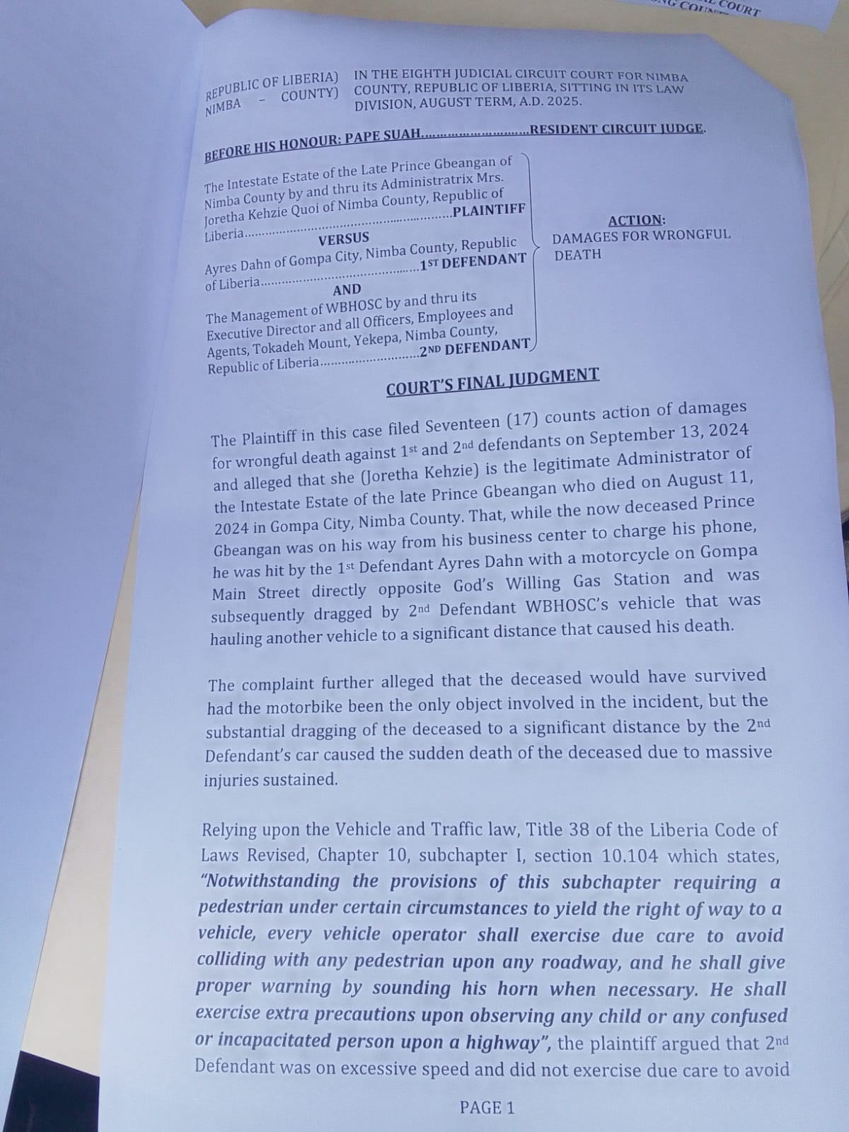 This covers, One Million five hundred thousand in general damages, One hundred and ninety-five thousand Liberian dollars in special damages and five Hundred Thousand United States Dollars in consequential damages to the family of the late Prince Gbeangan who was killed by a vehicle belonging to WBHOSC in Ganta, Nimba County.