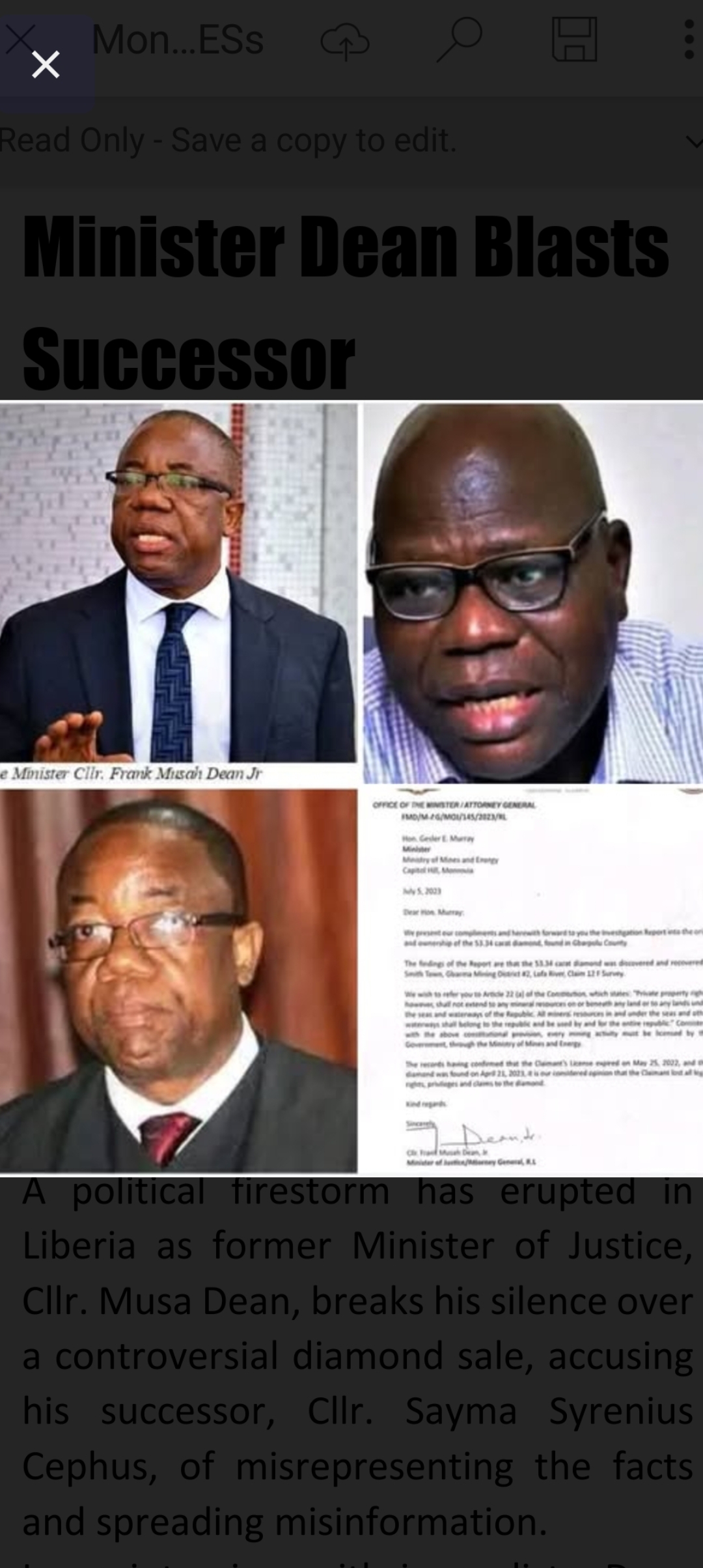 A political firestorm has erupted in Liberia as former Minister of Justice, Cllr. Musa Dean, breaks his silence over a controversial diamond sale, accusing his successor, Cllr. Sayma Syrenius Cephus, of misrepresenting the facts and spreading misinformation.