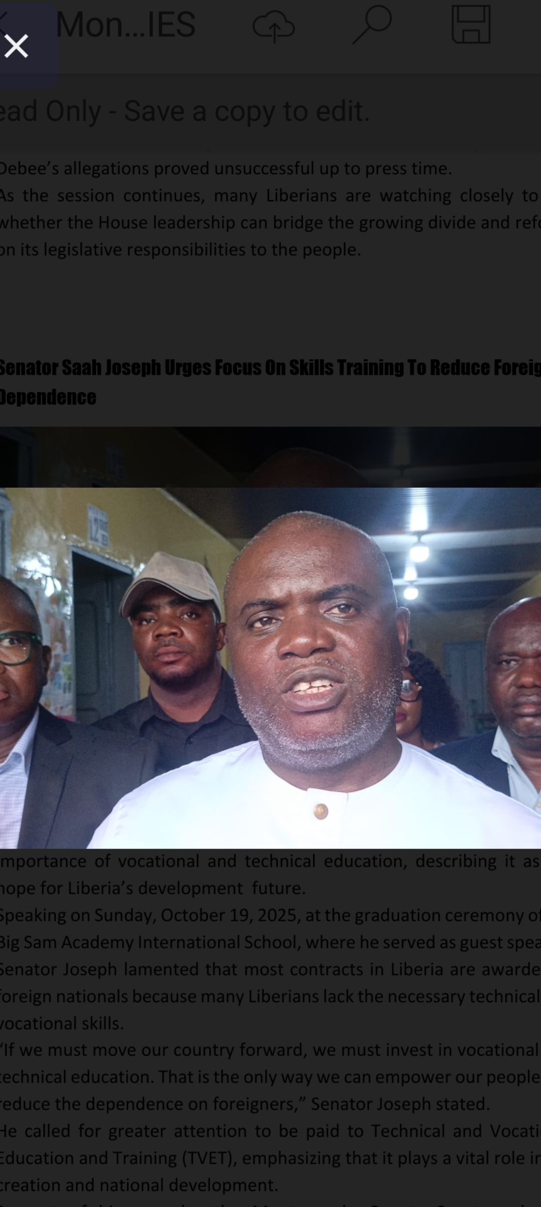 Speaking on Sunday, October 19, 2025, at the graduation ceremony of the Big Sam Academy International School, where he served as guest speaker, Senator Joseph lamented that most contracts in Liberia are awarded to foreign nationals because many Liberians lack the necessary technical and vocational skills.