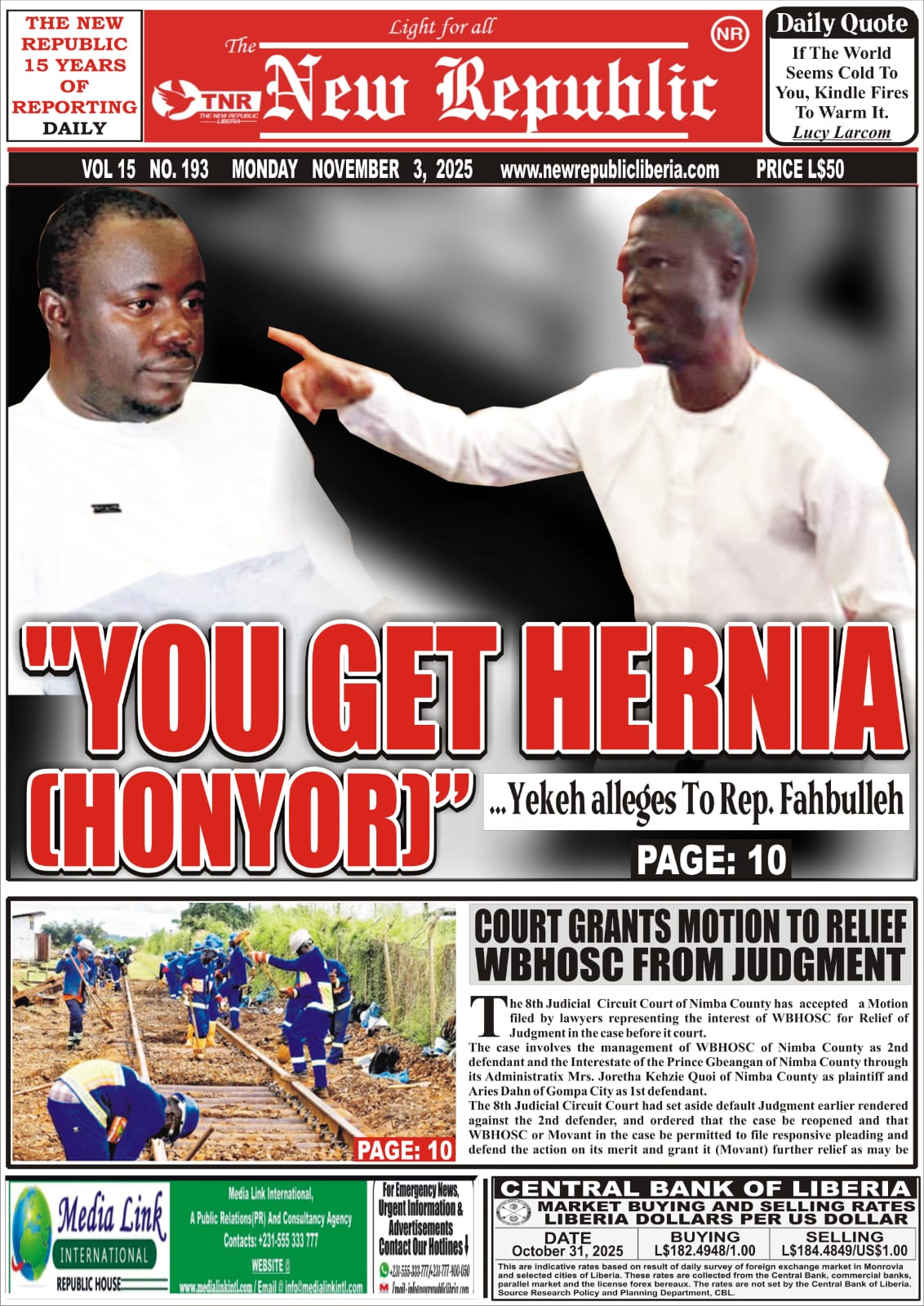 MONROVIA-NOVEMBER 3, 2025: REPRESENTATIVE Yekeh Kolubah of district number ten Montserrado County, has alleged that Rep. Foday Fahnbulleh, of Bong County district seven has Hernia.